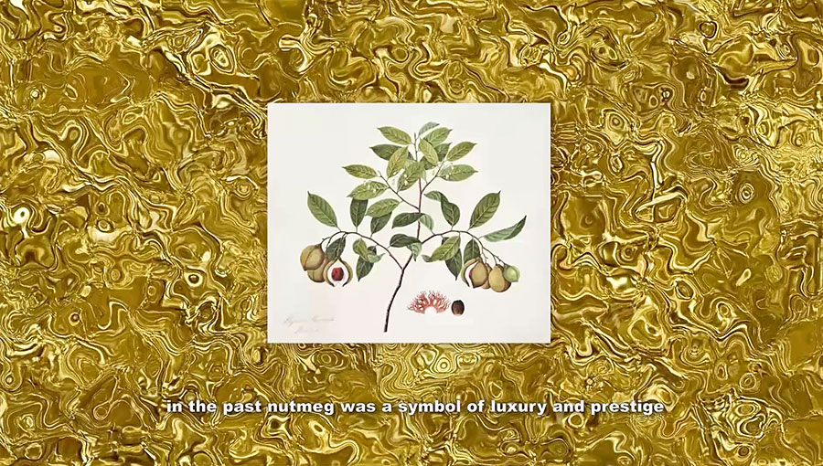 Myristica Fragrans, 2018. HD video and sound, 4 min 30 sec. Commisioned by Watermans Gallery, London 2018.